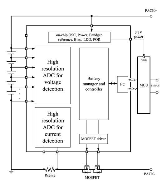 鋰電池組保護芯片HSM12X0系列包括HSM1220、HSM1230和HSM1240。該系列芯片內部集成了高精度ADC可以對電池組的電壓、電流以及溫度信號進行采集并通過I2C接口將數據傳遞給主機微控制器。該芯片還具有簡單的過壓保護、欠壓保護、過流保護以及短路保護,支持被動均衡。