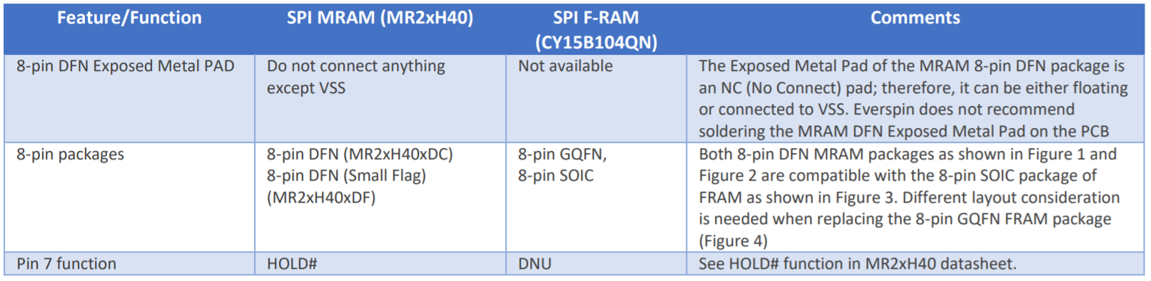 MR2xH40xDF是組織為512Kx8的4Mb非易失性RAM,采用標(biāo)稱3.3V電源供電,并且與FRAM兼容。它提供標(biāo)準(zhǔn)的8引腳小標(biāo)志DFN(DF版)和8引腳DFN(DC版),它們是多功能封裝選項,可以用SPI-FRAM8引腳SOIC和8引腳GQFN替代它。包(表1)。從硬件的角度來看,關(guān)鍵的區(qū)別在于用于封裝引腳(引腳7)的PCB的變化。從軟件的角度來看,這兩個設(shè)備之間的主要區(qū)別在于引腳7的功能和設(shè)備ID。當(dāng)主機CPU必須中斷存儲器時,使用MR2xH40xDF的HOLD#引腳(引腳7)另一個任務(wù)的操作。當(dāng)HOLD#為LOW時,當(dāng)前操作被掛起。設(shè)備將忽略SCK或CS#上的任何過渡。當(dāng)SCK為低電平時,必須在HOLD#上進行所有轉(zhuǎn)換。如果不使用,此引腳必須連接到VDD。可能需要更改硬件和軟件才能在MRAM上啟用HOLD#功能。