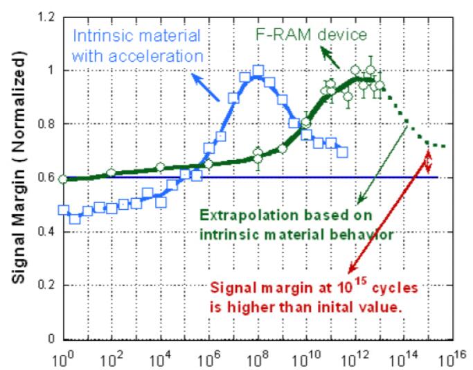 圖1.FRAM器件和本征材料的信號裕量與周期的關(guān)系圖顯示,與初始值相比,F(xiàn)RAM器件在1015個(gè)周期時(shí)的信號裕量更高。