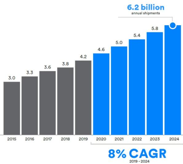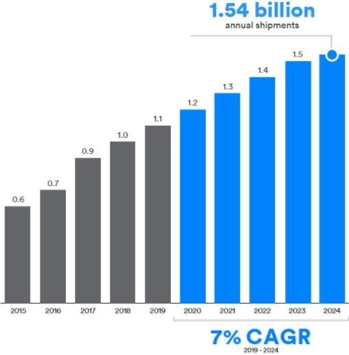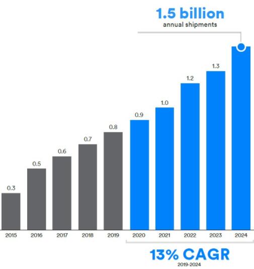 ● 音頻流應(yīng)用包括:語音通話、收聽音頻/音樂、視聽設(shè)備、智能語音控制。2019-2024年增長率為7%,到2024年出貨量將達(dá)15.4億個(gè)。