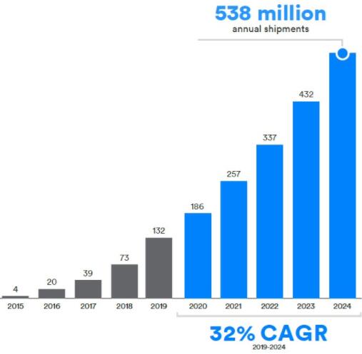 ● 定位服務(wù)應(yīng)用包括:物品標(biāo)簽、倉儲(chǔ)貨物管理、室內(nèi)定位導(dǎo)航、訪問控制等。2019-2024年增長率為32%,到2024年出貨量將達(dá)5.38億個(gè)。