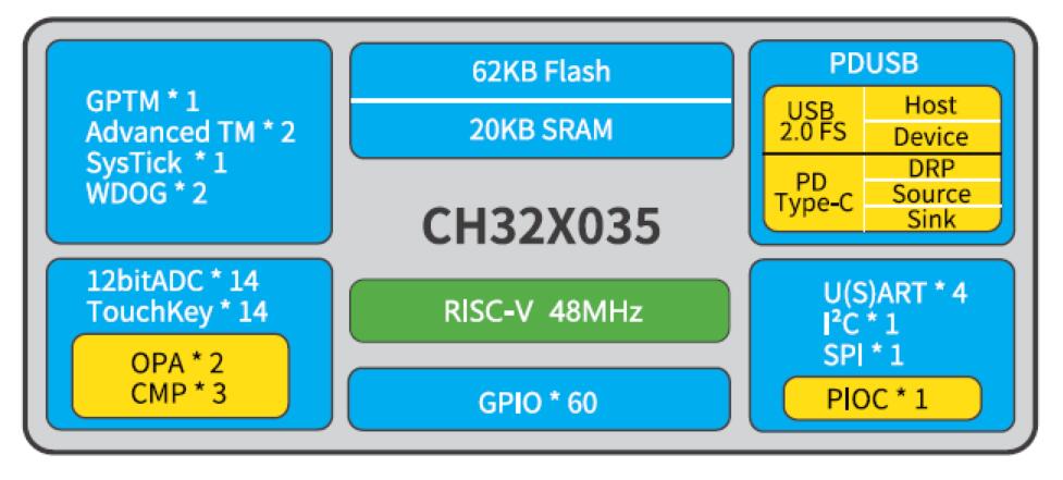 CH32X035系列是基于青稞V4C內(nèi)核設(shè)計(jì)的工業(yè)級微控制器。內(nèi)置USB和PD PHY,支持USB Host主機(jī)和USBDevice設(shè)備功能、PDUSB及Type-C快充功能,內(nèi)置可編程協(xié)議I/O控制器,提供OPA運(yùn)放、CMP電壓比較器、USART串口、/2C、SPI、定時(shí)器、12位ADC、Touchkey等豐富外設(shè)資源。
