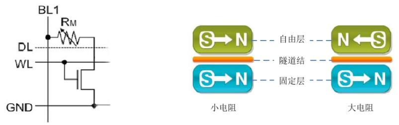 MRAM是以磁性隧道結(MTJ)儲存單元為基礎。MTJ中包含了一個維持單一極性方向的固定層,和一個通過隧道結與其隔離的自由層。當自由層被施予和固定層相同方向的極化時,MTJ的隧道結便會顯現出低電阻特性;反之MTJ便會有高電阻。此磁阻效應可使MRAM不需改變內存狀態,便能快速讀取數據。當流經兩金屬線的電流足以切換MTJ的磁場時,在兩金屬線交點的MTJ就會被極化(寫入)。此過程能以