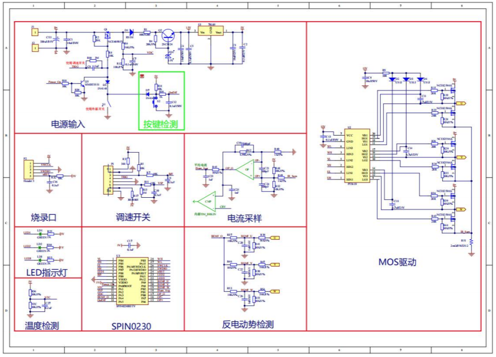 -通過反電動勢分壓電路檢測過零點信號得到位置信息,對應六種不同的逆變器MOS管驅動順序,實現BLDC電機的六步換相。