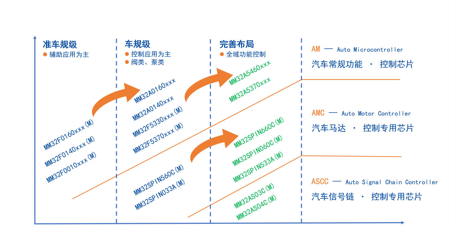 在芯片品類上,靈動微電子的汽車應用產(chǎn)品則可劃分為以MM32F、MM32A系列為代表的汽車常規(guī)功能控制芯片、專為汽車馬達應用打造的多個MM32SPIN系列控制專用芯片以及未來將推出的針對汽車信號鏈應用的控制專用芯片。