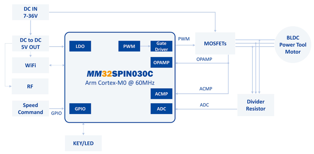 MM32SPIN030C這款MCU最大的亮點就是在其內部集成了36V的3P-+3N預驅,5V LDO高集成的電控SoC,可以直接驅動外部的6個P+NLMOS管,得益于內部集成預驅的設計。