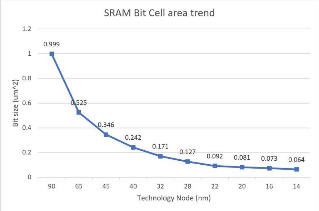 圖2位單元趨勢顯示隨著過程節(jié)點縮小,縮放比例逐漸減小。