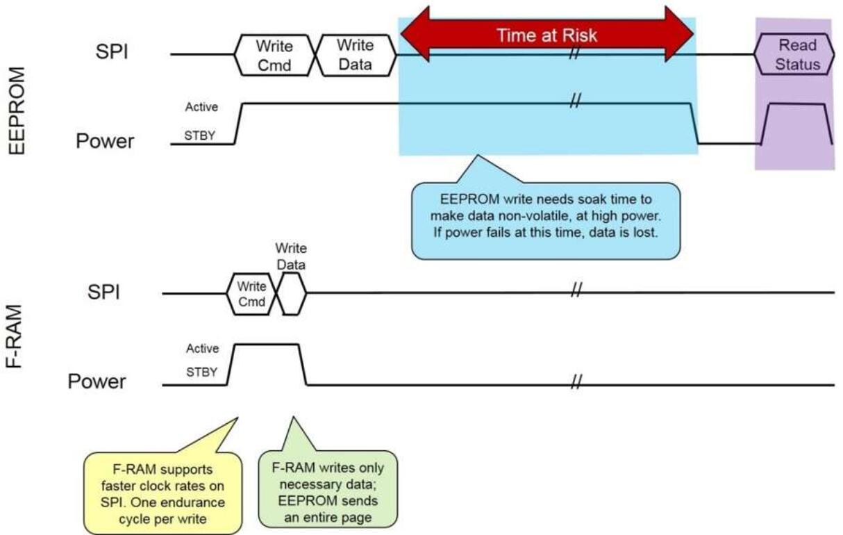 圖2:FRAM的快速寫入速度可保護使用EEPROM設(shè)備時可能丟失的關(guān)鍵數(shù)據(jù)。(來源:賽普拉斯半導體)
