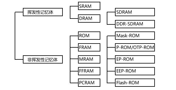 非揮發性存儲器(Non-Volatile Memory,NVM):電源開啟時資料存在,電源關閉資料仍然可以保留,例如:ROM、PROM、EPROM、EEPROM、Flash ROM、FRAM、MRAM、RRAM、PCRAM 等。