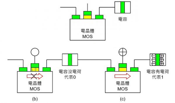 DRAM 使用一個電晶體(MOS)與一個電容來儲存一個位的資料(一個 0 或一個 1),如圖四(a)所示,當電晶體(MOS)不導通時沒有電子流過,電容沒有電荷,代表這一個位的資料是 0,如圖四(b)所示;當電晶體(MOS)導通時(在閘極施加正電壓),電子會由源極流向汲極,電容有電荷,代表這一個位的資料是 1,為了要將這些流過來的電荷“儲存起來”,因此必須使用一個微小的電容,如圖四(c)所示,DRAM 就是因為電容需要時間充電,所以速度比 SRAM 還慢。